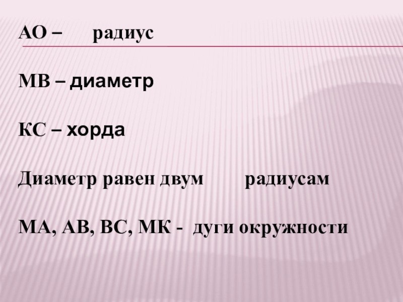 АО –   радиусМВ – диаметрКС – хорда Диаметр равен двум    радиусам МА,