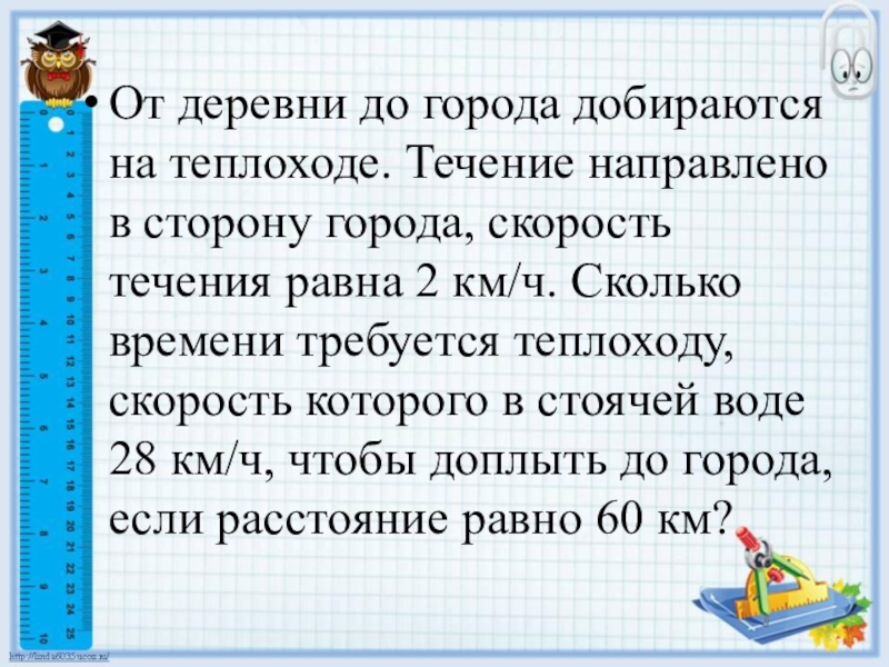 Слайд 19От деревни до города добираются на теплоходе. Течение направлено в сторону