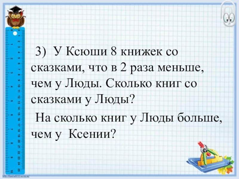 Слайд 12 3) У Ксюши 8 книжек со сказками, что