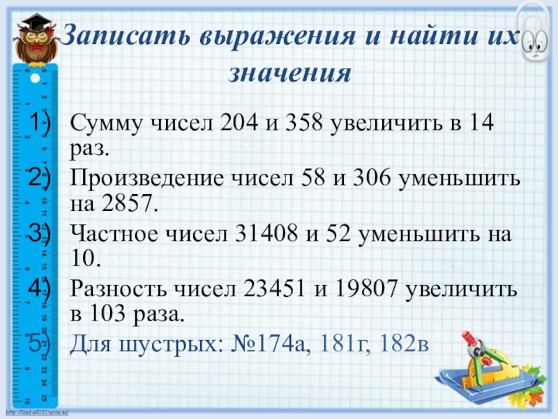 Слайд 8Записать выражения и найти их значения