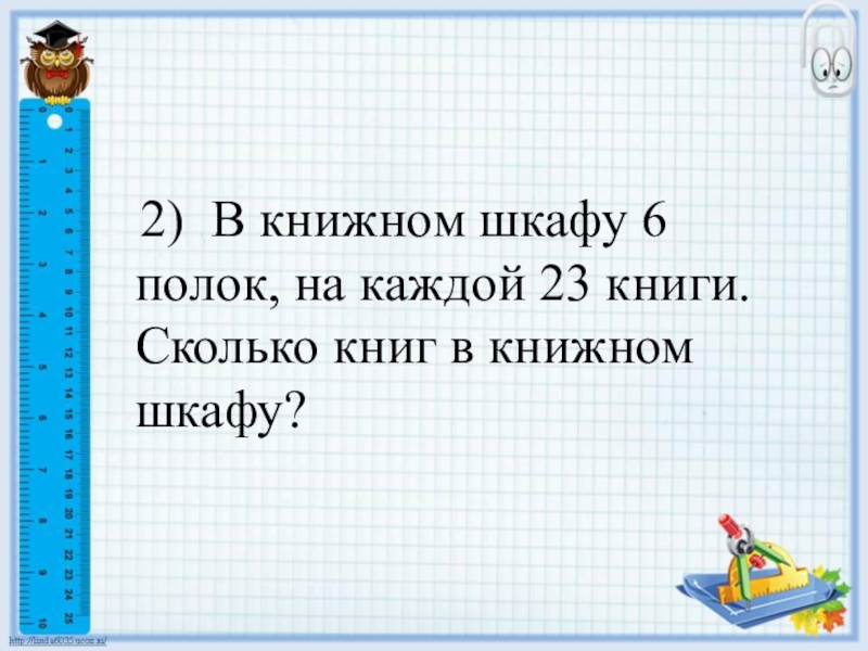 Слайд 11 2) В книжном шкафу 6 полок, на каждой 23 книги.