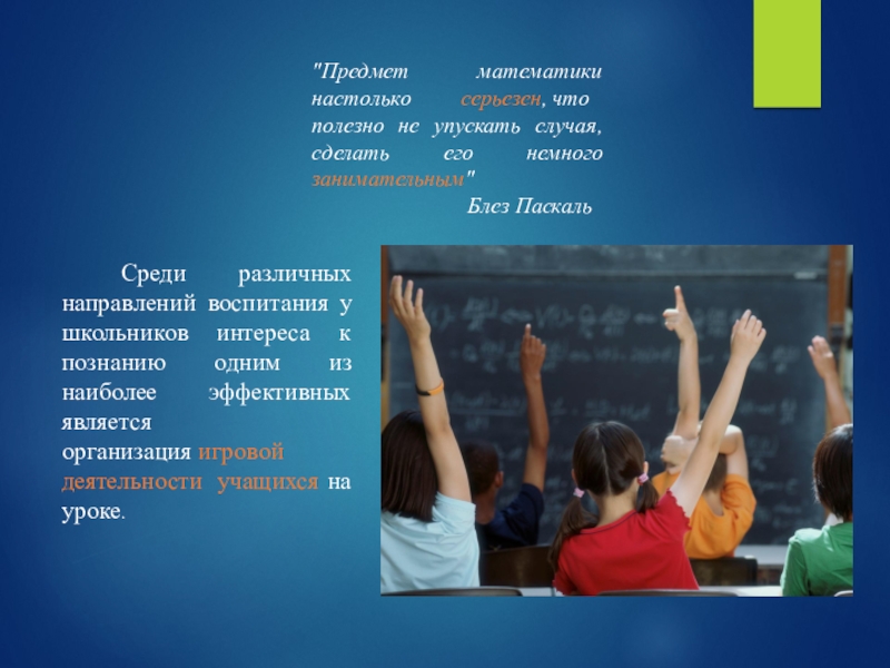 Среди различных направлений воспитания у школьников интереса к познанию одним из наиболее эффективных является организация игровой деятельности учащихся на уроке.