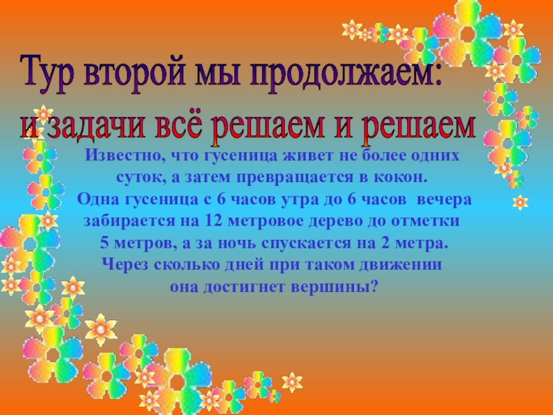 Одна гусеница с 6 часов утра до 6 часов вечера забирается на 12 метровое дерево до отметки