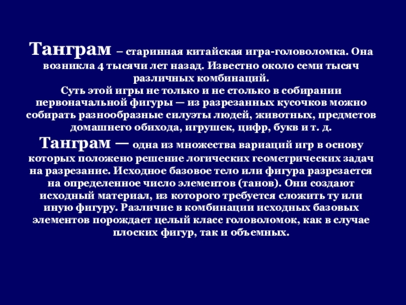 Танграм – старинная китайская игра-головоломка. Она возникла 4 тысячи лет назад. Известно около семи тысяч различных комбинаций.