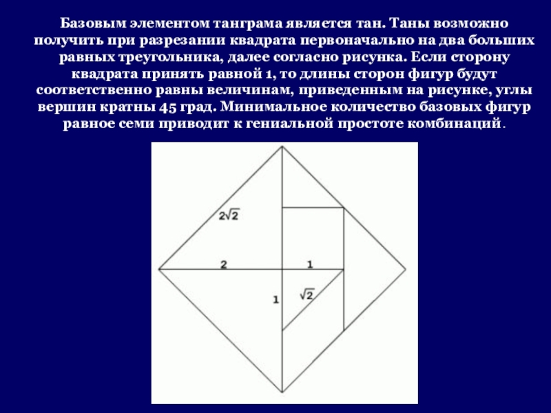 Слайд 3Базовым элементом танграма является тан. Таны возможно получить при разрезании квадрата