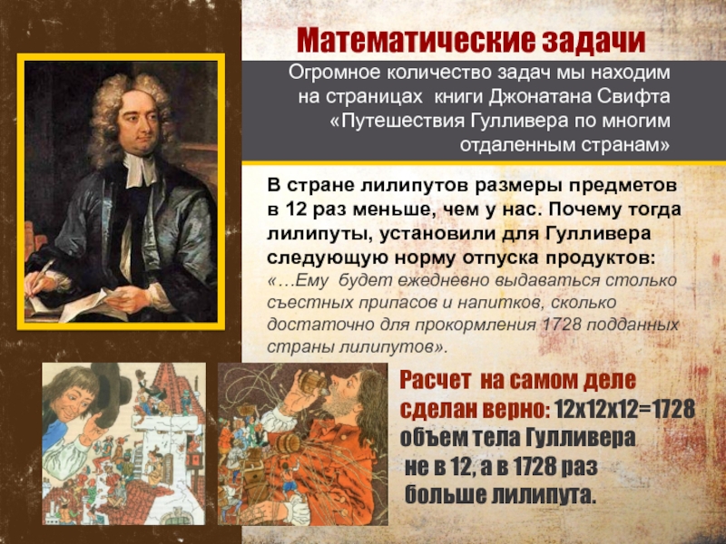 В стране лилипутов размеры предметов в 12 раз меньше, чем у нас. Почему тогда лилипуты, установили для Гулливера следующую норму отпуска продуктов: «…Ему будет ежедневно выдаваться столько съестных припасов и напитков, сколько достаточно для прокормления 1728 подданных страны лилипутов».