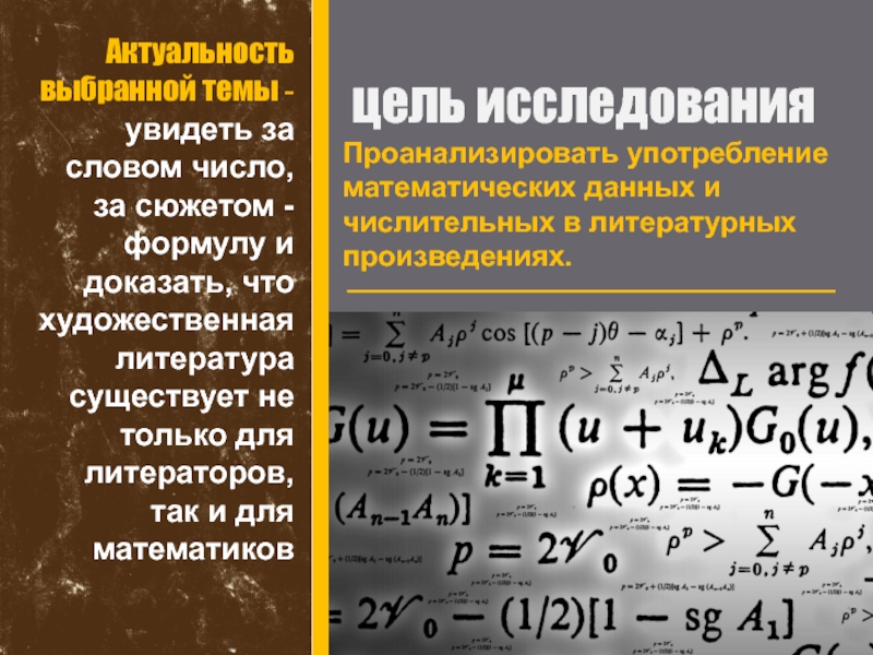 Актуальность выбранной темы - увидеть за словом число, за сюжетом - формулу и доказать, что художественная литература существует не только для литераторов, так и для математиков