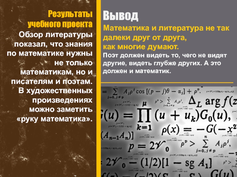 Обзор литературы показал, что знания по математике нужны не только математикам, но и писателям и поэтам. В художественных произведениях можно заметить «руку математика».