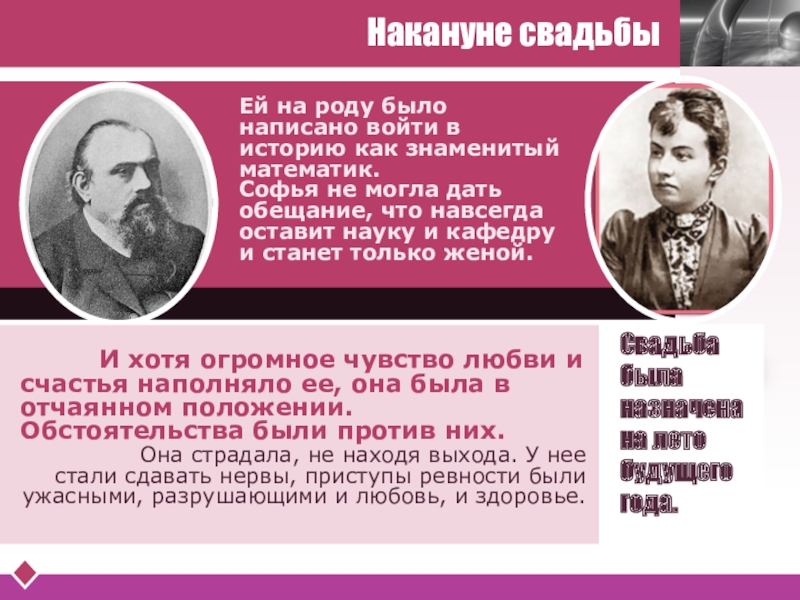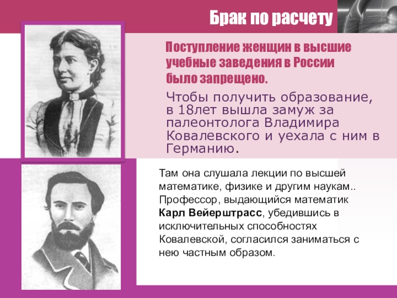 Там она слушала лекции по высшей математике, физике и другим наукам.. Профессор, выдающийся математик Карл Вейерштрасс, убедившись в исключительных способностях Ковалевской, согласился заниматься с нею частным образом.