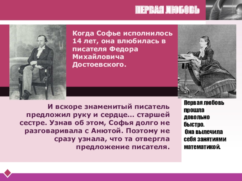 И вскоре знаменитый писатель предложил руку и сердце… старшей сестре. Узнав об этом, Софья долго не разговаривала с Анютой. Поэтому не сразу узнала, что та отвергла предложение писателя.