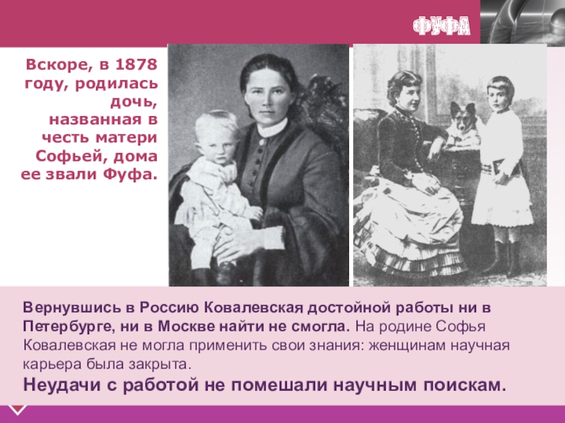 Вернувшись в Россию Ковалевская достойной работы ни в Петербурге, ни в Москве найти не смогла. На родине Софья Ковалевская не могла применить свои знания: женщинам научная карьера была закрыта.
