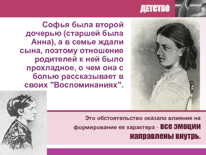 Это обстоятельство оказало влияние на формирование ее характера - все эмоции направлены внутрь.