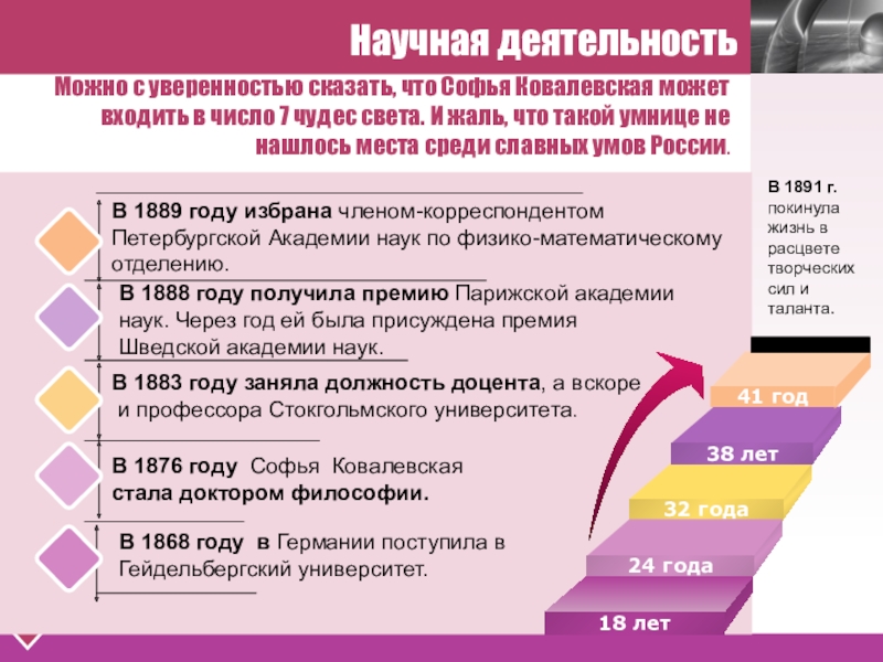 Можно с уверенностью сказать, что Софья Ковалевская может входить в число 7 чудес света. И жаль, что такой умнице не нашлось места среди славных умов России.