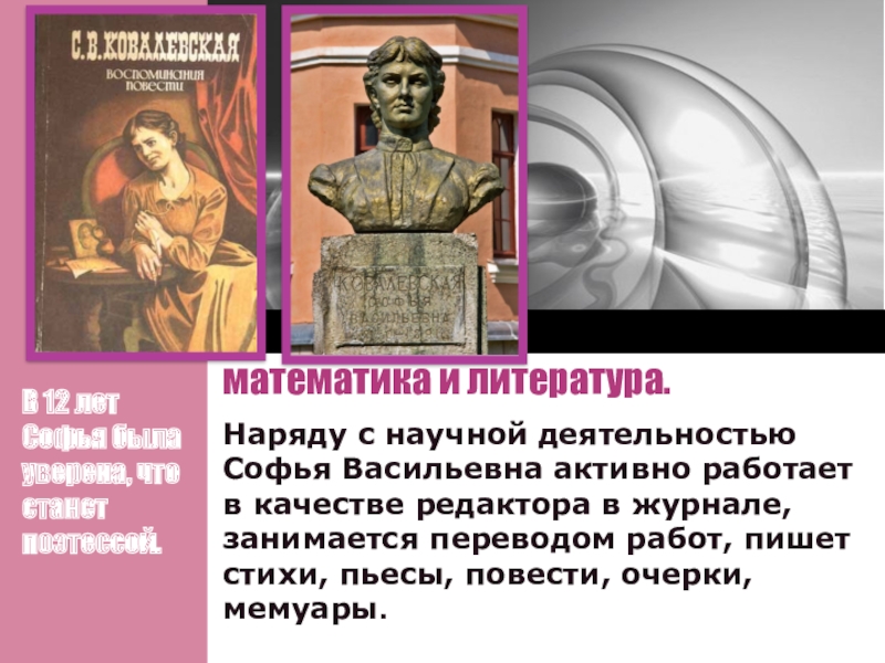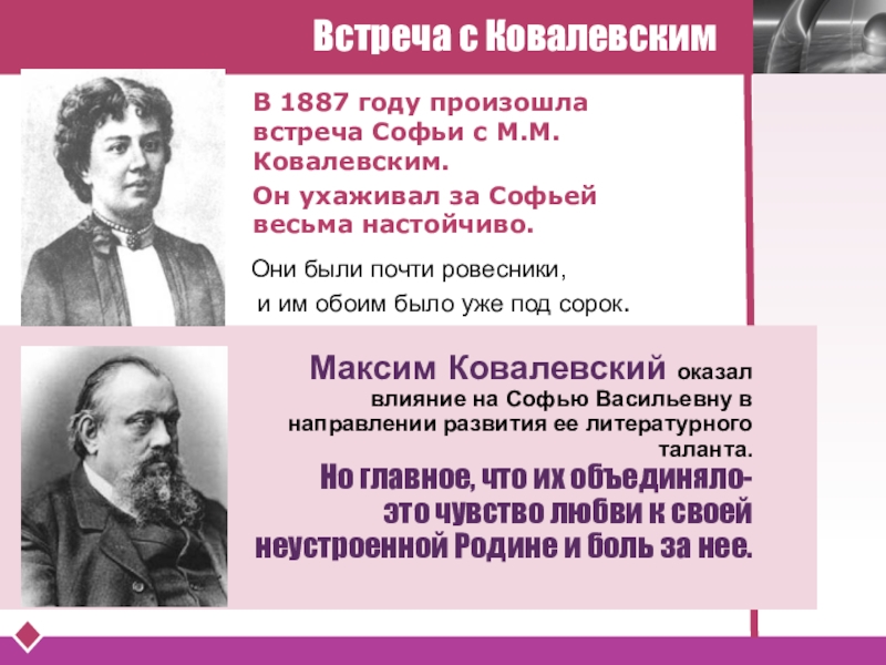 Максим Ковалевский оказал влияние на Софью Васильевну в направлении развития ее литературного таланта.