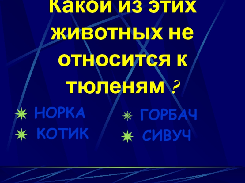 Слайд 4Какой из этих животных не относится к тюленям ?