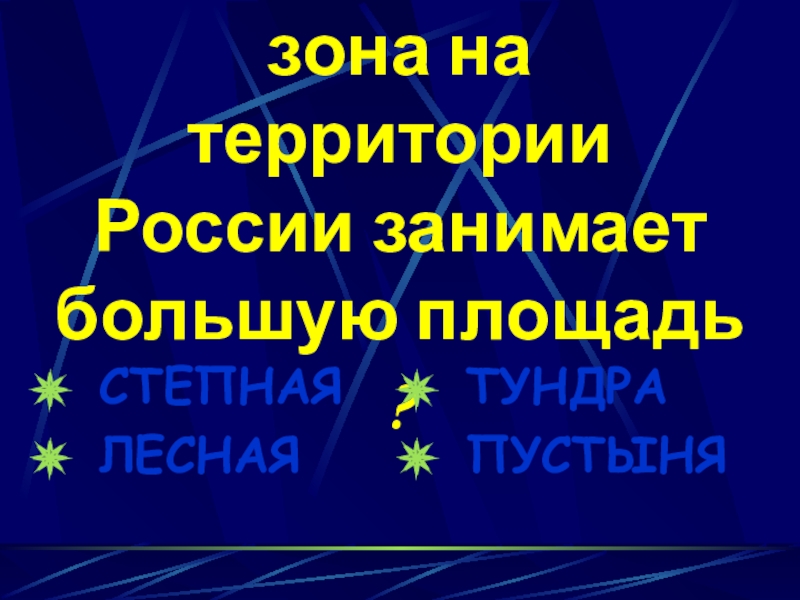 Слайд 14Какая природная зона на территории России занимает большую площадь ?