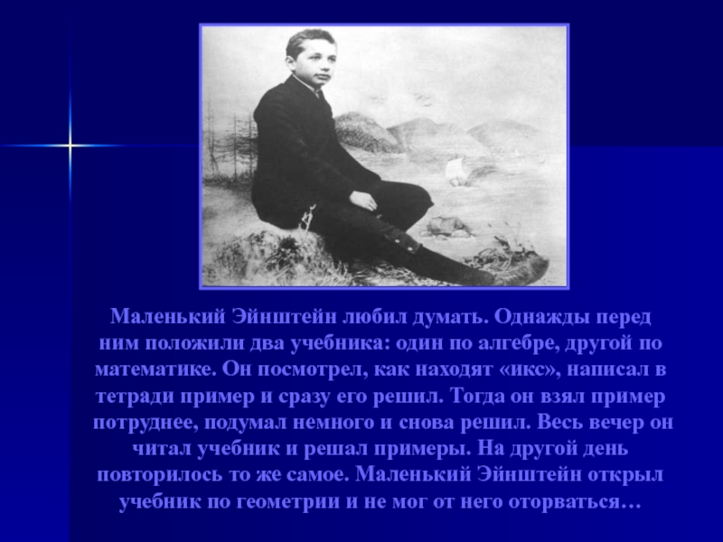 по алгебре, другой по математике. Он посмотрел, как находят «икс», написал в тетради пример и сразу его решил. Тогда он взял пример потруднее, подумал немного и снова решил. Весь вечер он читал учебник и решал примеры. На другой день повторилось то же самое. Маленький Эйнштейн открыл учебник по геометрии и не мог от него оторваться…