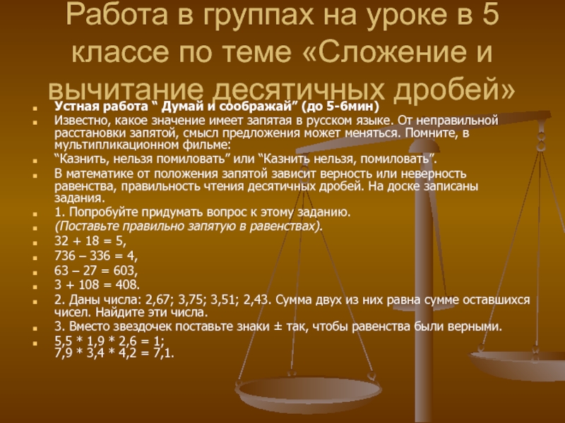 В математике от положения запятой зависит верность или неверность равенства, правильность чтения десятичных дробей. На доске записаны задания.