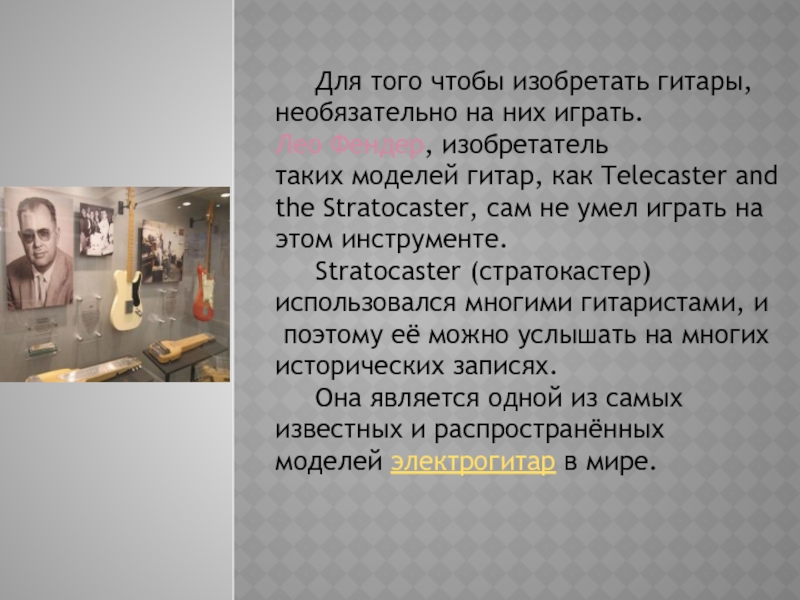 известных и распространённых моделей электрогитар в мире стратокастера, который сам не умел играть на этом инструменте (2 слова).