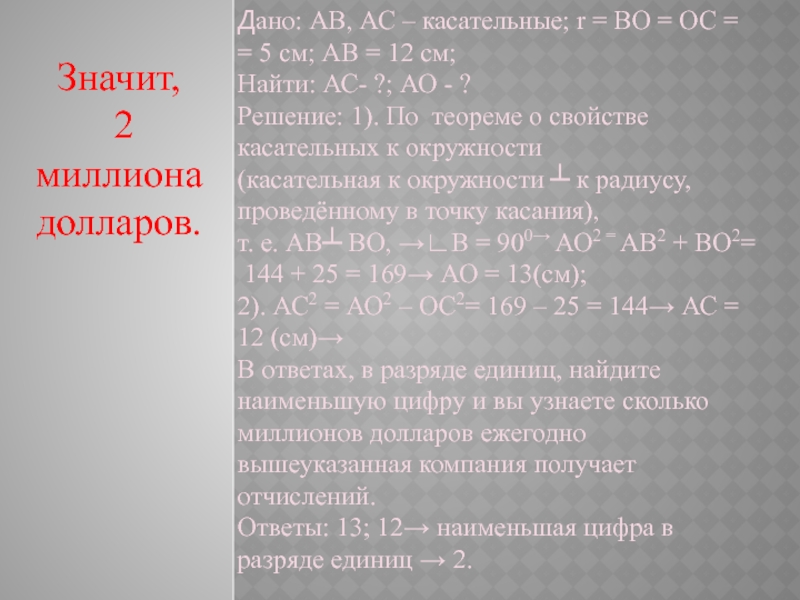 Слайд 25Дано: АВ, АС – касательные; r = ВО = ОС =