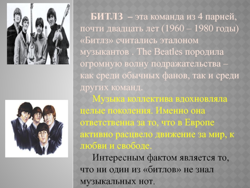 двадцать лет (1960 – 1980 годы) «Битлз» считались эталоном музыкантов . The Beatles породила огромную волну подражательства – как среди обычных фанов, так и среди других команд.