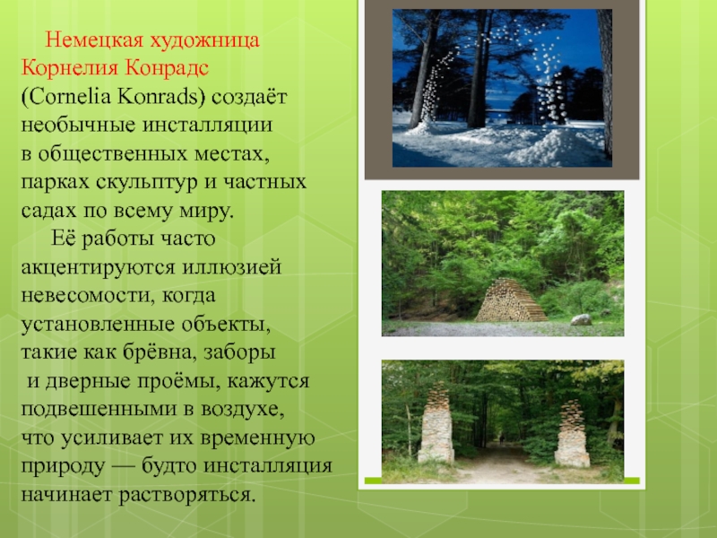 Необычные инсталляции в общественных местах, парках скульптур и частных садах по всему миру создаёт немецкая художница Корнелия ? (2 слога).