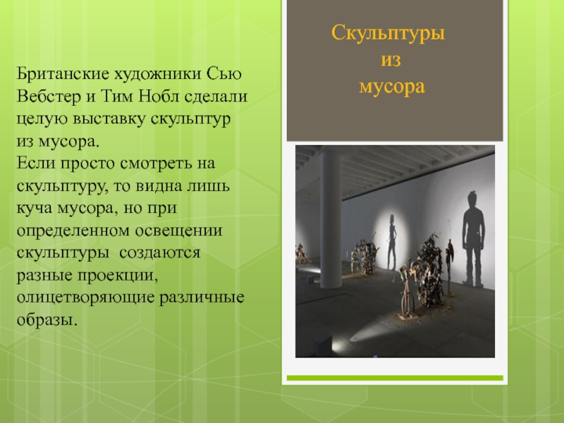 Если просто смотреть на скульптуру, то видна лишь куча мусора, но при определенном освещении скульптуры создаются разные проекции, олицетворяющие различные образы.