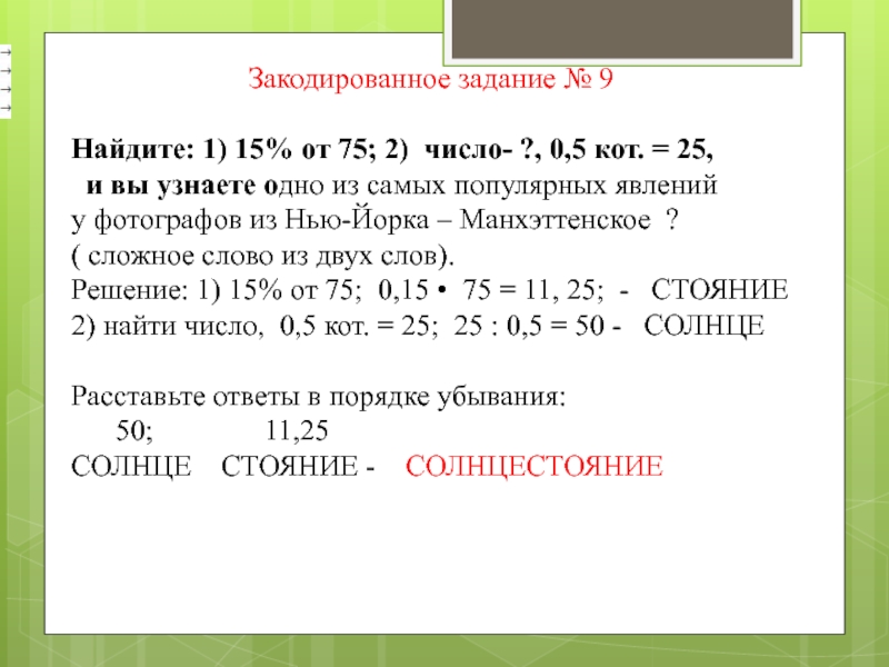 Решение: 1) 15% от 75; 0,15 • 75 = 11, 25; - СТОЯНИЕ