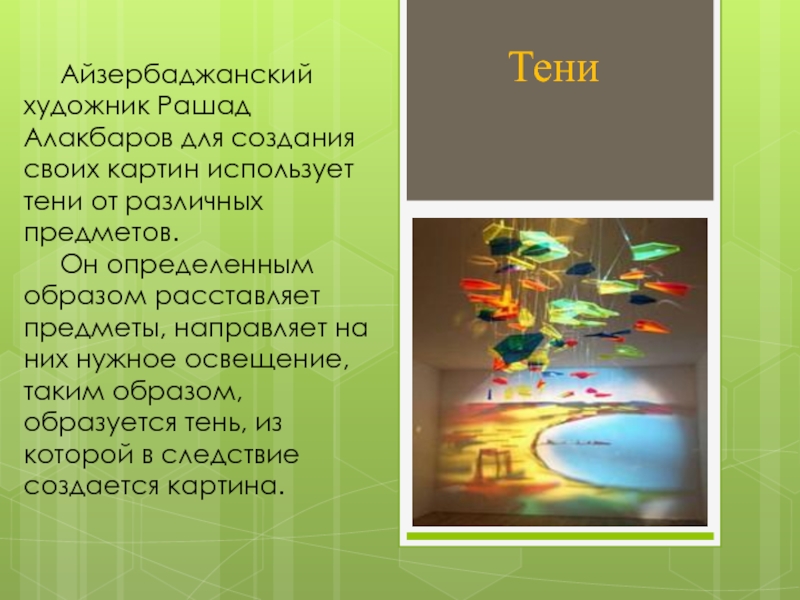 Он определенным образом расставляет предметы, направляет на них нужное освещение, таким образом, образуется тень, из которой в следствие создается картина.