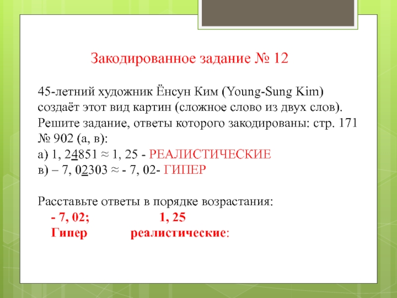 45-летний художник Ёнсун Ким (Young-Sung Kim) создаёт этот вид картин (сложное слово из двух слов). Решите задание, ответы которого закодированы: стр. 171 № 902 (а, в):