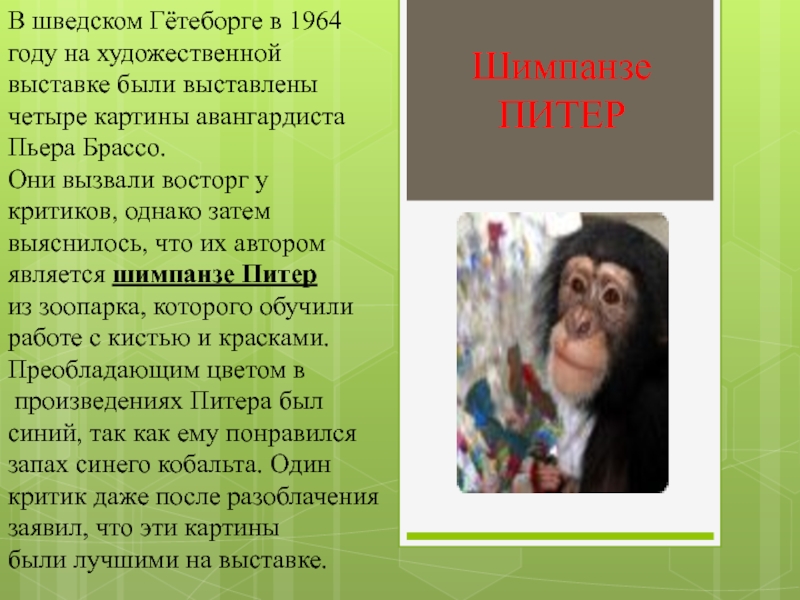 Они вызвали восторг у критиков, однако затем выяснилось, что их автором является шимпанзе Питер