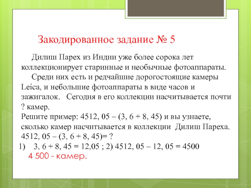 Решите пример: 4512, 05 – (3, 6 + 8, 45) и вы узнаете, сколько камер насчитывается в коллекции Дилиш Пареха.