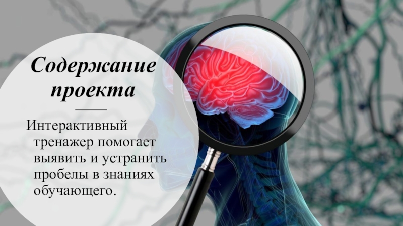 Содержание проектаИнтерактивный тренажер помогает выявить и устранить пробелы в знаниях обучающего.
