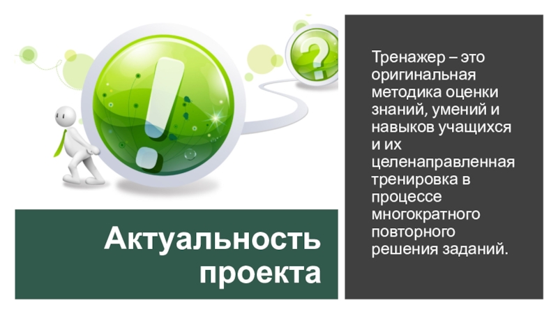 Актуальность проектаТренажер – это оригинальная методика оценки знаний, умений и навыков учащихся и их целенаправленная тренировка в