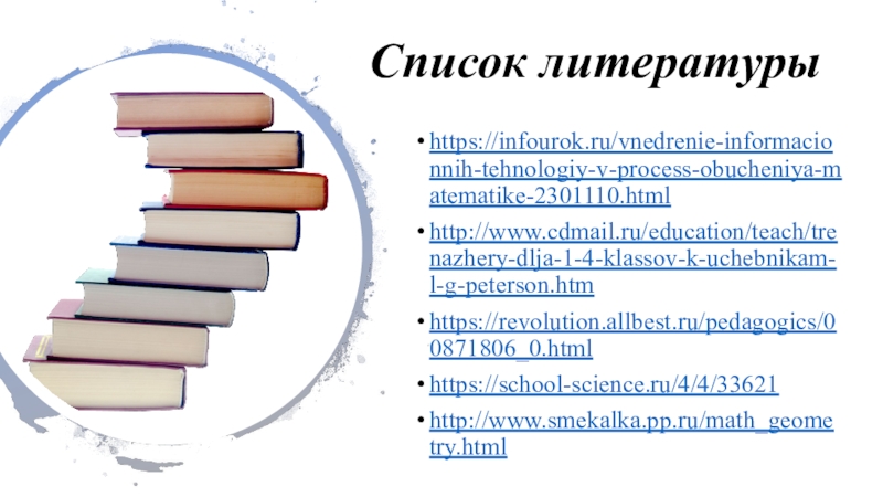 Список литературыhttps://infourok.ru/vnedrenie-informacionnih-tehnologiy-v-process-obucheniya-matematike-2301110.htmlhttp://www.cdmail.ru/education/teach/trenazhery-dlja-1-4-klassov-k-uchebnikam-l-g-peterson.htmhttps://revolution.allbest.ru/pedagogics/00871806_0.htmlhttps://school-science.ru/4/4/33621http://www.smekalka.pp.ru/math_geometry.html