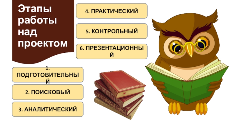 Этапы работы над проектом1. ПОДГОТОВИТЕЛЬНЫЙ2. ПОИСКОВЫЙ3. АНАЛИТИЧЕСКИЙ4. ПРАКТИЧЕСКИЙ5. КОНТРОЛЬНЫЙ6. ПРЕЗЕНТАЦИОННЫЙ