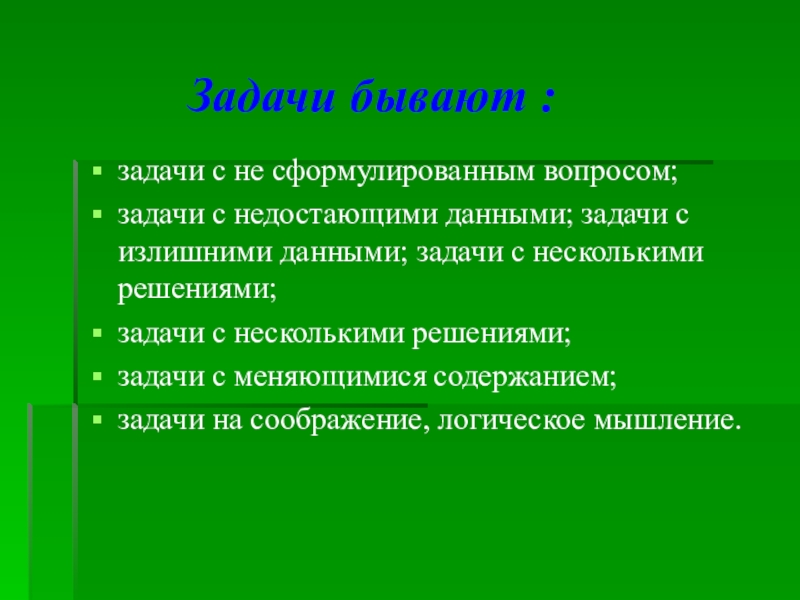 Проблемность при обучении математики возникает совершенно естественно, не требуя никаких специальных упражнений, искусственно подбираемых ситуаций. В сущности, не только каждая текстовая задача, но и добрая половина других упражнений, представленных в учебниках математики и дидактических материалах, и есть своего рода проблемы, над решением которых ученик должен задуматься, если не превращать их выполнения в чисто тренировочную работу, связанную с решением по готовому, данному учителем образцу.