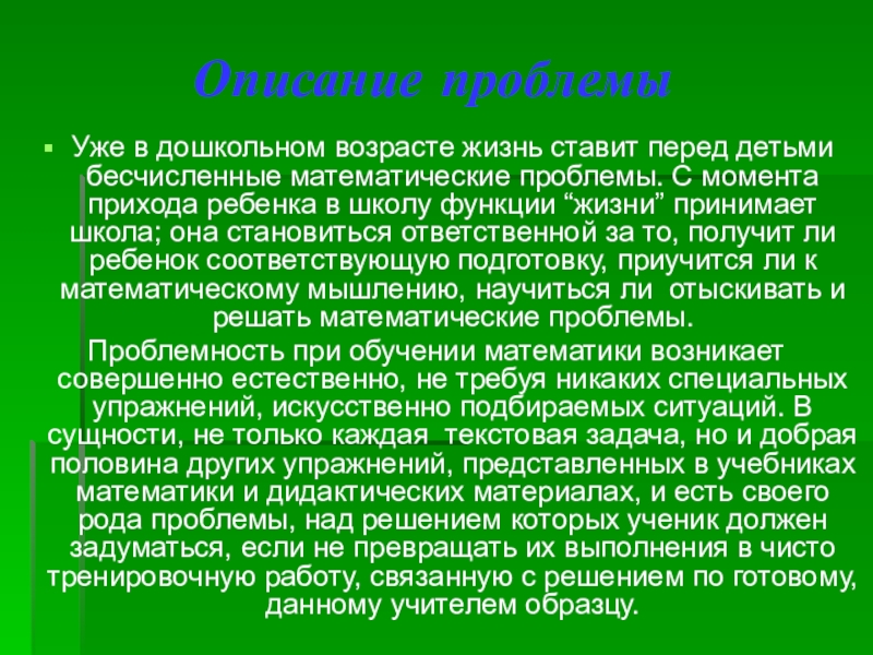 проблемы. С момента прихода ребенка в школу функции “жизни” принимает школа; она становиться ответственной за то, получит ли ребенок соответствующую подготовку, приучится ли к математическому мышлению, научиться ли отыскивать и решать математические проблемы.