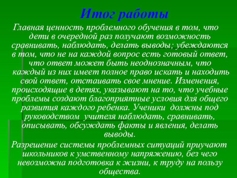 очередной раз получают возможность сравнивать, наблюдать, делать выводы; убеждаются в том, что не на каждой вопрос есть готовый ответ, что ответ может быть неоднозначным, что каждый из них имеет полное право искать и находить свой ответ, отстаивать свое мнение. Изменения, происходящие в детях, указывают на то, что учебные проблемы создают благоприятные условия для общего развития каждого ребенка. Ученики должны под руководством учителя наблюдать, сравнивать, описывать, обсуждать факты и явления, делать выводы.