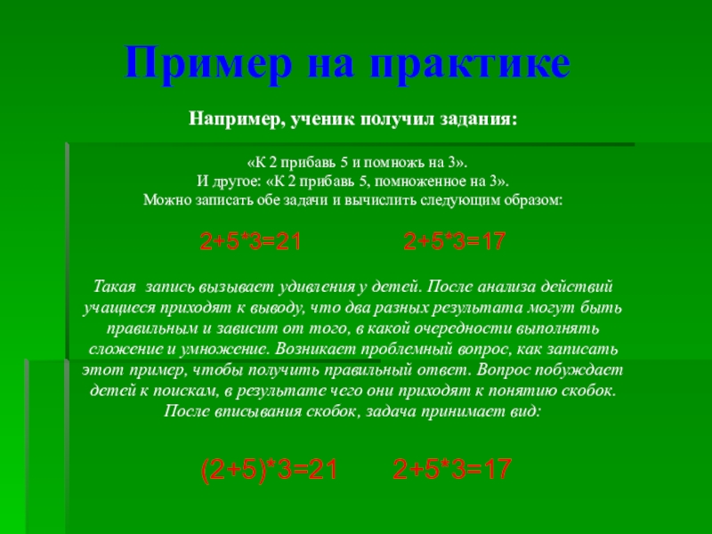 И другое: «К 2 прибавь 5, помноженное на 3».