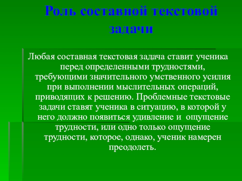 трудностями, требующими значительного умственного усилия при выполнении мыслительных операций, приводящих к решению. Проблемные текстовые задачи ставят ученика в ситуацию, в которой у него должно появиться удивление и ощущение трудности, или одно только ощущение трудности, которое, однако, ученик намерен преодолеть.
