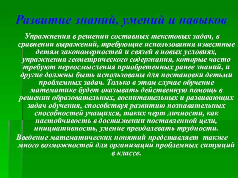 сравнении выражений, требующие использования известные детям закономерностей и связей в новых условиях, упражнения геометрического содержания, которые часто требуют переосмысления приобретенных ранее знаний, и другие должны быть использованы для постановки детьми проблемных задач. Только в этом случае обучение математике будет оказывать действенную помощь в решении образовательных, воспитательных и развивающих задач обучения, способствуя развитию познавательных способностей учащихся, таких черт личности, как настойчивость в достижении поставленной цели, инициативность, умение преодолевать трудности.