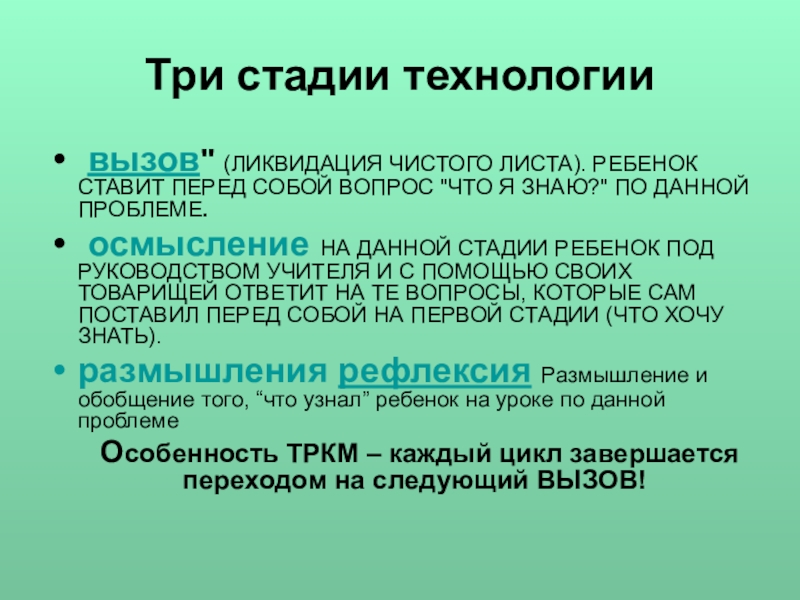 осмысление НА ДАННОЙ СТАДИИ РЕБЕНОК ПОД РУКОВОДСТВОМ УЧИТЕЛЯ И С ПОМОЩЬЮ СВОИХ ТОВАРИЩЕЙ ОТВЕТИТ НА ТЕ ВОПРОСЫ, КОТОРЫЕ САМ ПОСТАВИЛ ПЕРЕД СОБОЙ НА ПЕРВОЙ СТАДИИ (ЧТО ХОЧУ ЗНАТЬ).