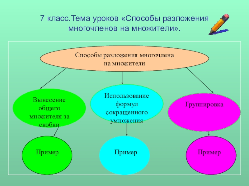 Слайд 127 класс.Тема уроков «Способы разложения многочленов на множители».