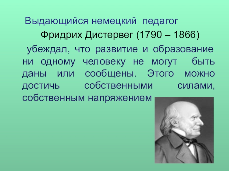 убеждал, что развитие и образование ни одному человеку не могут быть даны или сообщены. Этого можно достичь собственными силами, собственным напряжением