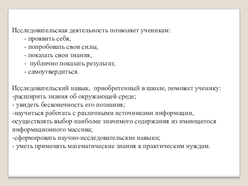 Развивать умение определять цели и задачи исследования, его предмет; самостоятельно работать с литературой; анализировать и систематизировать информацию; использовать моделирование, методы выдвижения гипотез; описание результатов; развивать умение делать выводы и обобщать.