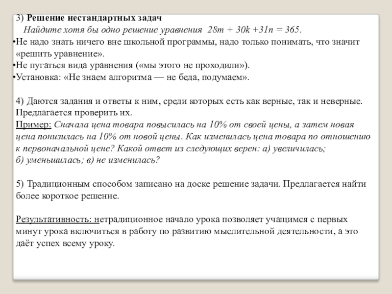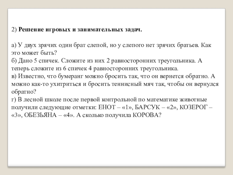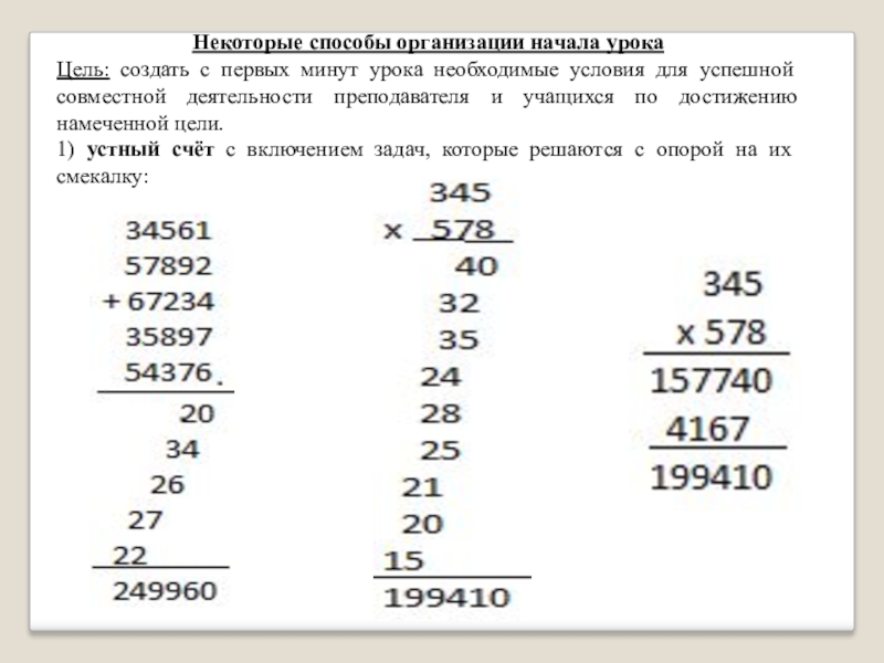 1) устный счёт с включением задач, которые решаются с опорой на их смекалку: