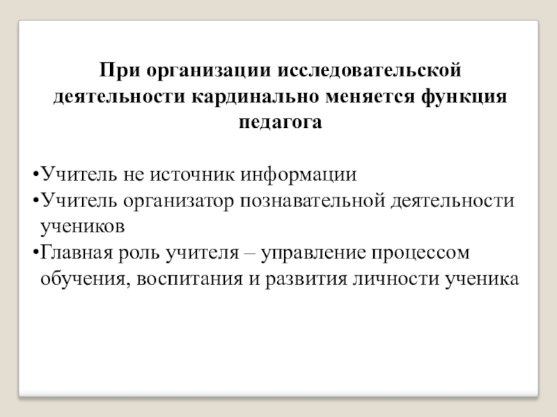 Слайд 3При организации исследовательской деятельности кардинально меняется функция педагога