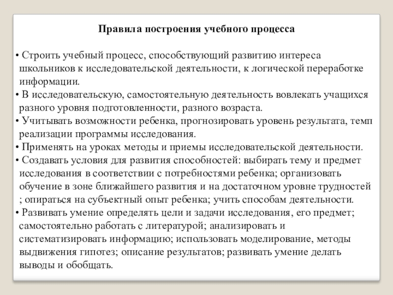 Создавать условия для развития способностей: выбирать тему и предмет исследования в соответствии с потребностями ребенка; организовать обучение в зоне ближайшего развития и на достаточном уровне трудностей ; опираться на субъектный опыт ребенка; учить способам деятельности.