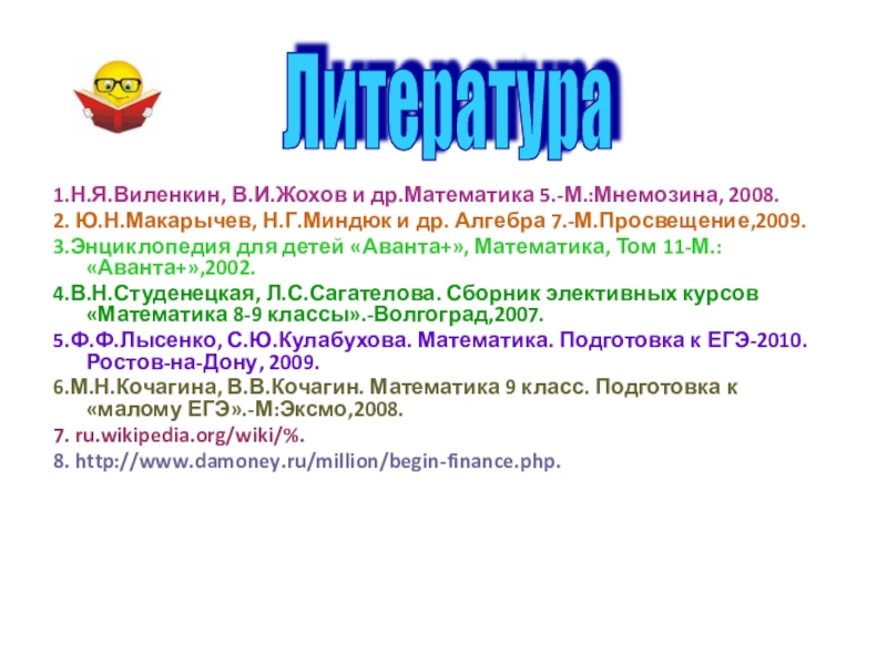 4.В.Н.Студенецкая, Л.С.Сагателова. Сборник элективных курсов «Математика 8-9 классы».-Волгоград,2007.